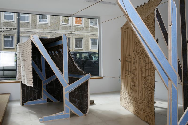 In the world of Studio Makkink & Bey many products are designed from a narrative point of view. For the Helmrinderknecht galery the studio designed a soft village of blankets, made of goat wool, which are hanging over tree-like wooden structures. Mohair woolen blankets hanging on a clothesline give shape to the space and divide it. Individually woven patterns and lines become a house’s exterior walls or reflect the imagery of the surrounding landscape. The washing line is draped in between simple wooden posts. Although these posts function as a laundry rack within the space, within the fictive landscape they become trees. Like houses, woolen blankets offer human beings protection and shelter. Taking care of warmth and security, they are roofs over our heads and tuck us comfortably in.