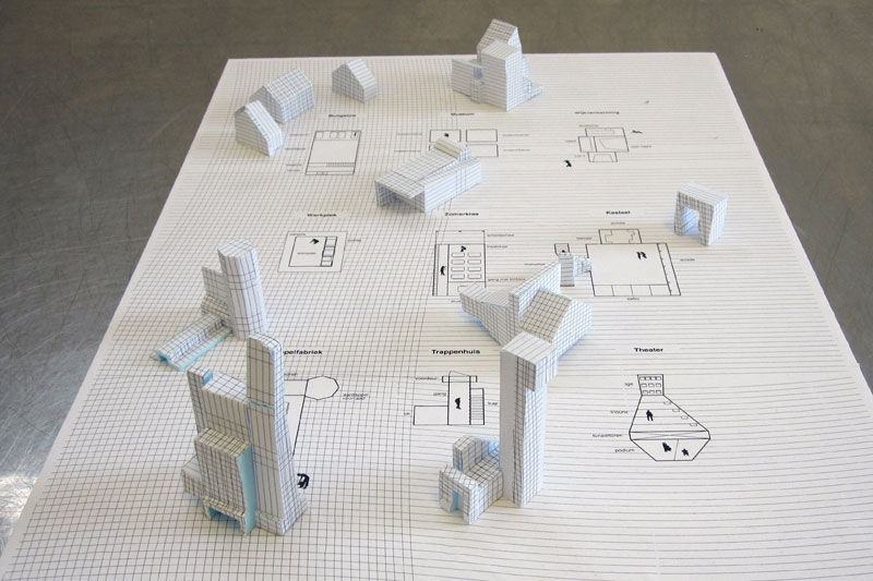 Sketch design proposing a plan to enrich the neighbourhood 'de Velden' in Groningen by reinforcing the local strengths. A composed house is placed is the neighbourhood in order to make an inventory of all the demands and local target groups. After the research period the different parts of the house are scattered throughout the neighbourhood, allowing each of the groups to own a piece of the house. In collaboration with an artist the different parts can then be adapted to their specific needs. The tap of the house could for instance become a fountain, the staircase turned into a porch where elderly meet, a reading table attached to a street lantern as a private nuance in the public domain.