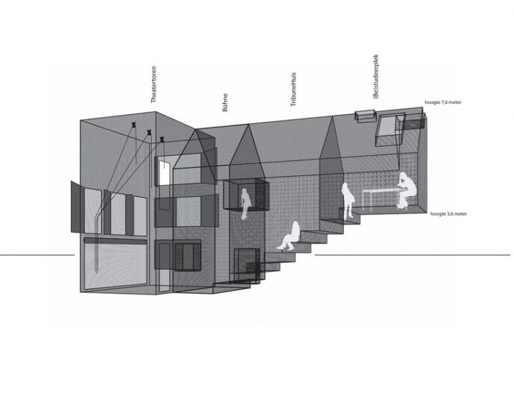 Sketch design proposing a plan to enrich the neighbourhood 'de Velden' in Groningen by reinforcing the local strengths. A composed house is placed is the neighbourhood in order to make an inventory of all the demands and local target groups. After the research period the different parts of the house are scattered throughout the neighbourhood, allowing each of the groups to own a piece of the house. In collaboration with an artist the different parts can then be adapted to their specific needs. The tap of the house could for instance become a fountain, the staircase turned into a porch where elderly meet, a reading table attached to a street lantern as a private nuance in the public domain.
