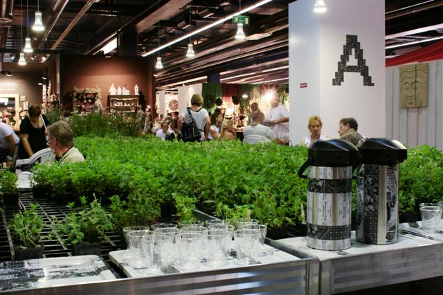 During the annual fair in Frankfurt, the studio made a bar where the visitors could sit down and have a cup of tea. De temporary bar was part herb garden on industrial metal plant tables and part assembly line with tea service.
